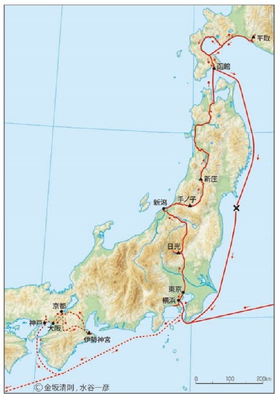1878年イザベラ・バードが巡った日本の旅の順路 金坂氏提示のスライド